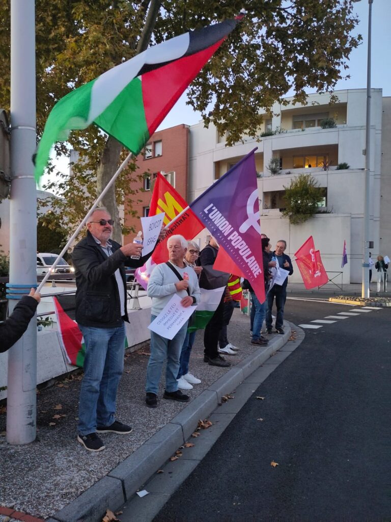 Ce lundi 6 octobre avec le #NPA, Ul Cgt Colomiers, Syndicat Sud, Lfi Colomiers se sont réunis sur le symbolique rond-point des Droits de l’Homme en soutien au peuple palestinien.